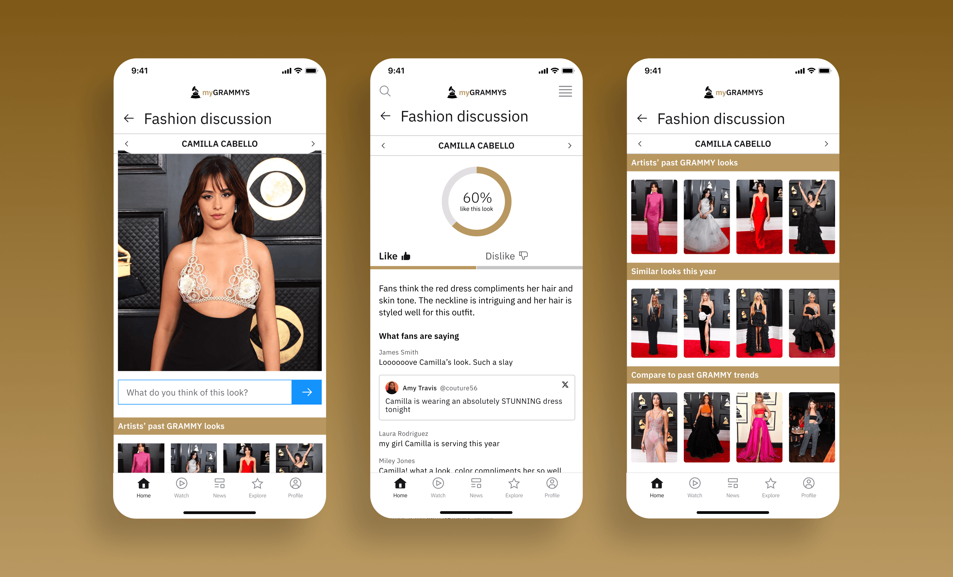 The myGRAMMYS experience targets the top affordances offered by award shows, providing a space to discourse with the music community, judge the Red Carpet looks, and dive deeper into the artists profile, enhanced by the personalization, integration and immersion of a digital application.