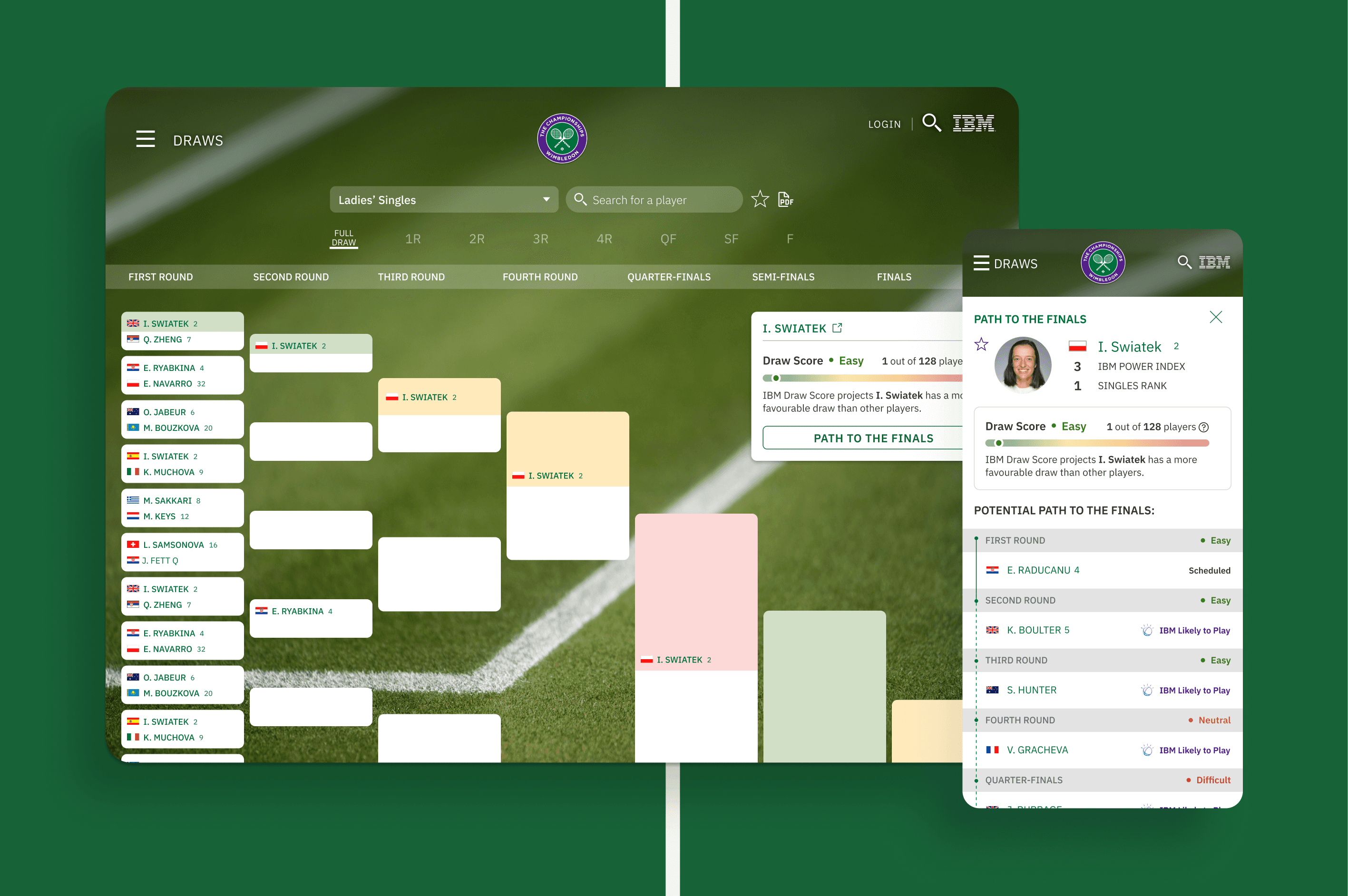IBM AI Draw Analysis lets Wimbledon fans make informed predictions about the tournament by providing a statistical factor "draw ranking" for each singles player. This favorability ranking is updated throughout the tournament to continuously provide insight into the difficulty that lies ahead for a given player. The Path to Finals feature visualizes this projected journey from the first round through the final.